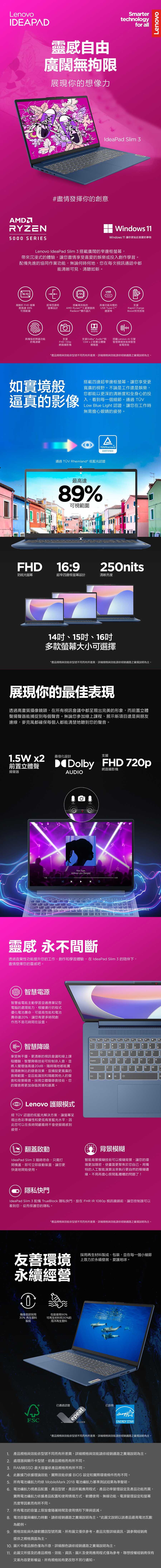 Lenovo IdeaPad Slim 3-82XM00UXTW 15.6吋 藍(R7 5825U/16G DDR4/512G PCIE/W11)